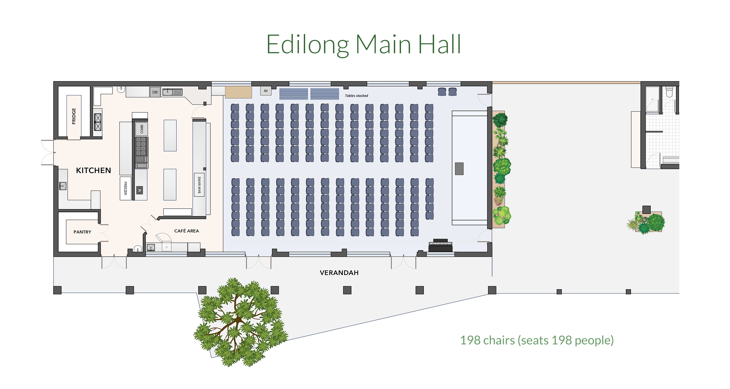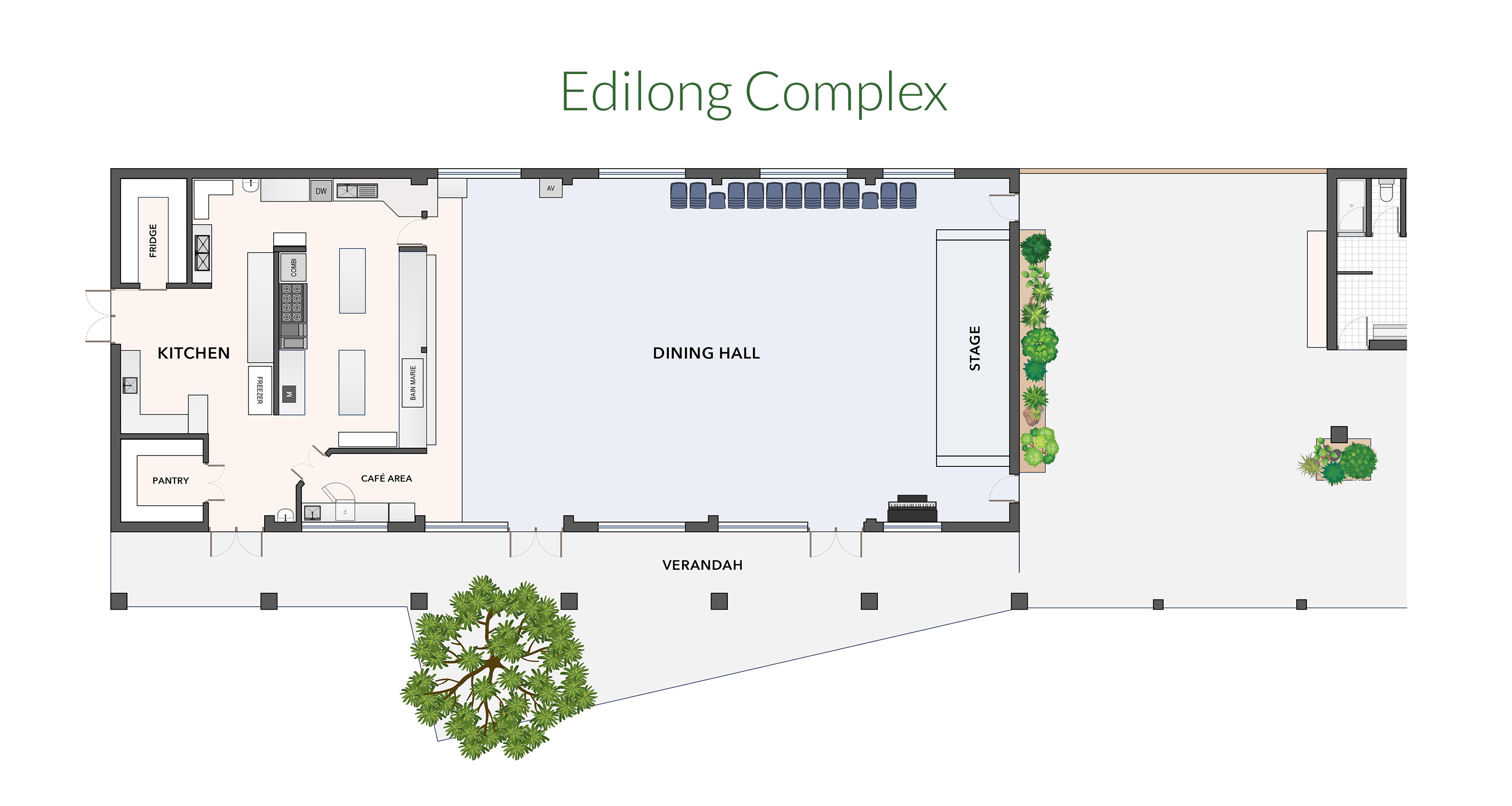 The complex has a well-equipped commercial kitchen, large dining/meeting hall, separate lounge room, covered outdoor area and first aid room.