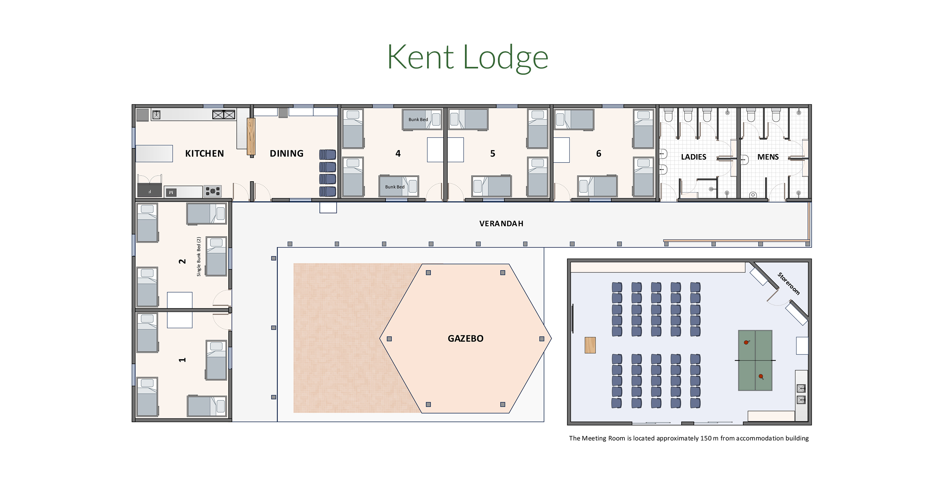 Kent Lodge has 40 beds, a kitchen, dining/meeting room, a covered gazebo and shared bathrooms (male and female).