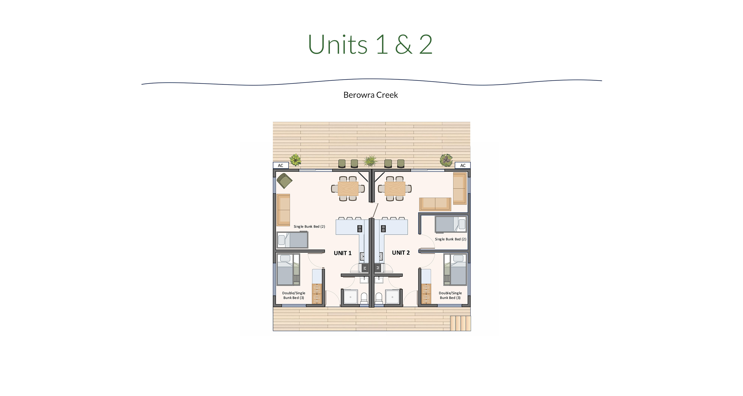 Each unit has a double bed with a single bunk above (3 beds); and a separate bunk (2 beds); as well as a kitchen-living area and bathroom. The units have air-conditioning and a TV.